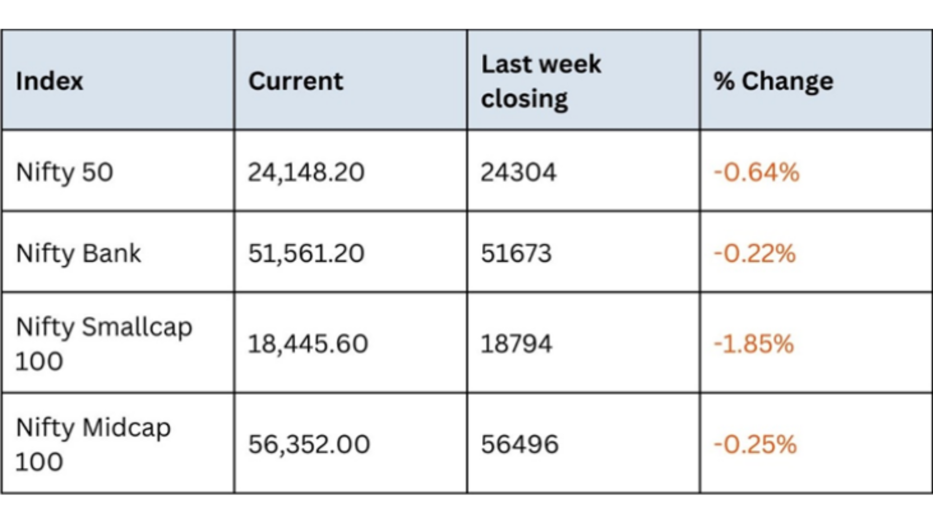 The Nifty 50, Nifty Bank, Nifty Smallcap 100, and Nifty Midcap 100 have experienced modest declines over the past week.